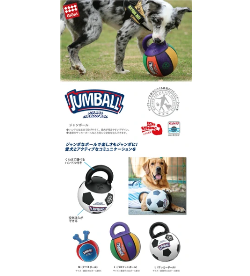 丈夫なハンドルが付いたジャンボなボールです。ハンドルは投げやすく、愛犬が咥えやすいデザインで、屋外での遊びに最適です。通常のサッカーボールなどと同じく空気を注入することができます。