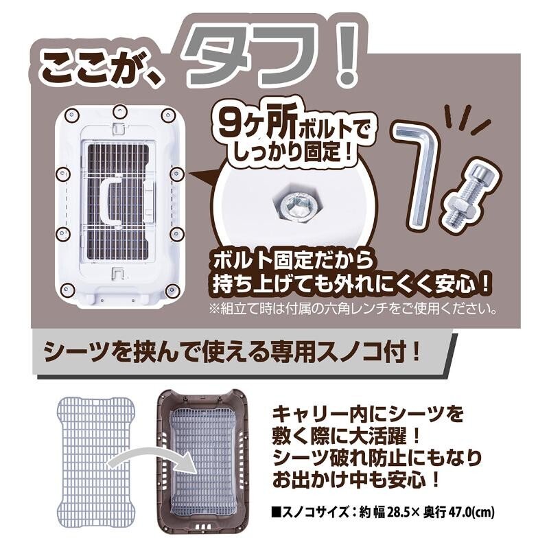 角ばった形状と、9箇所ボルト固定によるタフさが大きな特徴です。持ち上げた際のたゆみが少なく安定して運べます。専用スノコが付属しており、シーツをはさむことができるのでお出かけ中も安心です。正面ドアは左右開き可能で、付け外しも本体が組まれた状態で簡単に行えるので、ハウスとしての使用もしやすい作りになっています。