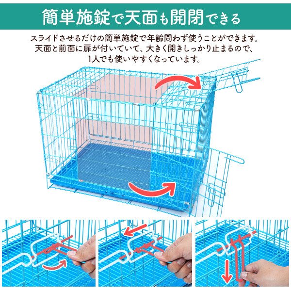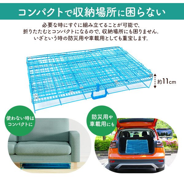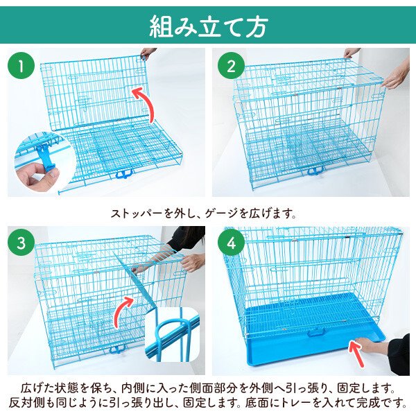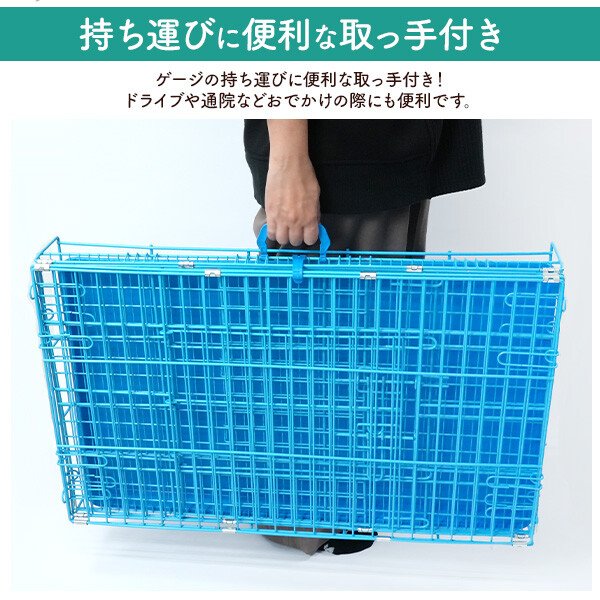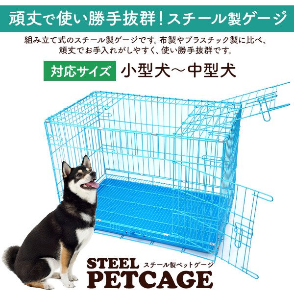 組み立て式のスチール製ケージです。布製やプラスチック製に比べ、 頑丈でお手入れがしやすく、使い勝手抜群です。 小型犬〜中型犬に使用できます。 取り出し可能なプラスチック製のトレー付き! 汚れた時も丸洗い出来て、いつでも清潔に保つことができます。 ケージの持ち運びに便利な取っ手付き! ドライブや通院などおでかけの際にも便利です。 必要な時にすぐに組み立てることが可能で、 折りたたむとコンパクトになるので、収納場所にも困りません。 いざという時の防災用や車載用としても重宝します。 スライドさせるだけの簡単施錠で年齢問わず使うことができます。 天面と前面に扉が付いていて、大きく開きしっかり止まるので、 1人でも使いやすくなっています。 サイズ(約) 高さ56×奥行48×幅76cm 重さ(約) 8kg |